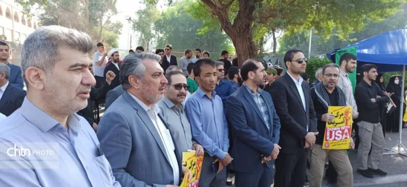 به گزارش روابطعمومی ادارهکل میراثفرهنگی، گردشگری و صنایعدستی خوزستان، همزمان با سراسر کشور و در سالروز ۱۳ آبان (روز دانشآموز و تسخیر لانه جاسوسی آمریکا به دست دانشجویان) کارکنان ادارهکل میراثفرهنگی، گردشگری و صنایعدستی خوزستان باحضور پرشور خود در این راهپیمائی، استواری ملت ایران در مقابل استکبار را به نمایش گذاشتند و خواهان حمایت از جبهه مقاومت و ملت مظلوم و آزادی خواهان جهان و فلسطین اشغالی شدند.