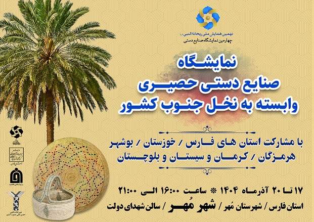 به گزارش روابط عمومی اداره کل میراث فرهنگی، گردشگری و صنایع دستی استان خوزستان، سیدمحمد عبودزاده امروز یکشنبه ۱۶ آذر 1404 با اعلام این خبر افزود: این نمایشگاه از 17 تا 20 آذر ۱۴۰۴ در شهرستان مُهر استان فارس برگزار میشود و هنرمندان صنایع دستی استانهای خوزستان، بوشهر، هرمزگان، سیستان و بلوچستان، کرمان و فارس آثار و محصولات حصیری و کاربردی خود را در معرض دید عموم قرار خواهند داد.